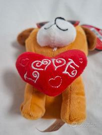 Regala amore con il cagnolino che stringe un cuore rosso con scritto "LOVE".