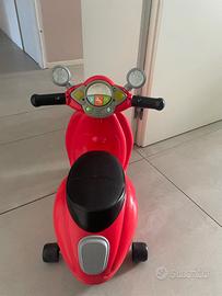 Cavalcabile 2in1 (ovvero con ruote di supporto rimovibili) ispirato al design della vespa primavera con dettagli e suoni realistici. Arricchito da un pannello elettronico, integrato nel volante, con luci e suoni.