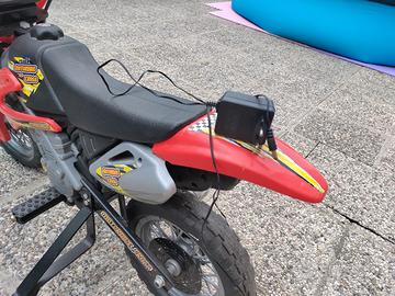 Moto Cross 400Fè un moto elettrica con motore a 6V e due rotelle per migliorare la stabilità (rimuovibili come si vede in foto, può essere utilizzata anche senza). Ha un pulsante per accelerare. Raggiunge i 3 km/h circa. Completa di batteria semi nuova (un paio di cicli di carica) e caricabatterie. Funzionante, in buono stato