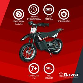Vendo moto per bambini Razor MX125 usata ma in ottime condizioni, prima della vendita sostituirò la batteria con una batteria nuova (dimostrabile con ricevuta), possiedo anche la scatola originale ben conservata. Su youtube trovate anche video, non è il solito giocattolo ma è una vera e divertentissima piccola moto per bambini raggiunge i 13 km . Preferisco CONSEGNO a mano a BOLOGNA zona san ruffillo, valuto spedizione solo con pagamento anticipato tramite bonifico. Descrizione: Razor Moto Elettrica per Bambini - MX125 Dirt Rocket Bike per Bambini dai 7 Anni in su con 13km/h di Velocità Massima e 40 Minuti di Autonomia, 100W con Batteria da 12 V 5Ah e Pneumatici da 12 SPERIENZE AUTENTICHE: Introducete il vostro bambino al brivido del motocross con Razor Mx125 Dirt Rocket, la nostra più piccola moto in scala ridotta, ideale per le esplorazioni all'aperto. FATTA PER I BAMBINI: Progettata pensando ai ciclisti più piccoli, i bambini dai 7 anni in su (fino a 50 kg) apprezzeranno la vestibilità personalizzata della bicicletta, mentre acquistano sicurezza sullo sterrato. PRESTAZIONI POTENTI: il bambino può pedalare fino a 40 minuti a una velocità massima di 13 km/h con una sola carica della batteria da 12 V 5 Ah inclusa. GUIDA PIÙ FLUIDA: Pensando al comfort del vostro bambino, abbiamo progettato questo cavalcabile con trazione posteriore e pneumatici da motocross da 12", ideali per il fuoristrada in tutte le condizioni!