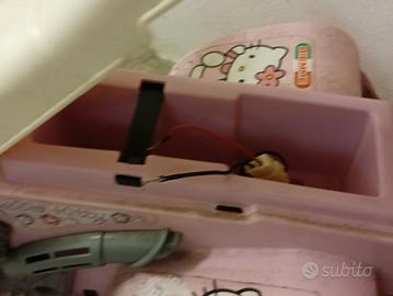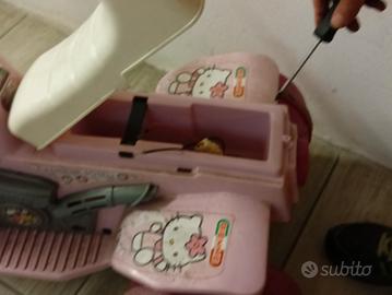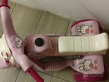 Motoretta elettrica a tre ruote con fantasie a tema Hello Kitty. È sprovvista della batteria necessaria per il funzionamento e del cavo per la ricarica. Adeguata per bambini da uno a tre anni.