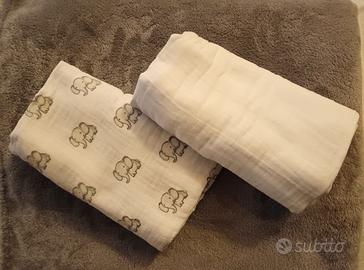 Set 2 mussole per neonati in cotone leggero. F.to 80 x 80 cm. Col. : bianco tinta unita + bianco fantasia elefantini grigi.