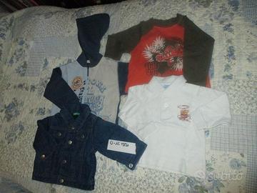 Nr. 4 capi per 0-12 mesi per mezzi tempi: 1 cardigan in cotone con cappuccio blu, bianco e celeste, si chiude con cerniera; 1 polo bianca e 1 maglia di cotone a maniche lunghe a fantasia (E 2 cad.); 1 giubbino di jeans di Benetton di cotone foderato di pile per 9 mesi (h 66 cm) E 5. Disponibili, per inutilizzo, altro abbigliamento varie età: smanicati, giubbini leggeri e pesanti, montgomery, jeans, bermuda, t-shirt, maglie di cotone a manica lunga, costumi da bagno e per Carnevale anche per recite scolastiche, alcune tute e alcune paia di scarpe, 2 abiti per Comunione per damigella: il 1° classico, l'altro più particolare, 1 coprispalle in filo colore panna e rosa antico lavorato a mano all'uncinetto, 1 culla Pali Cuccioli, 1 trapunta per culla, 1 lumetto per stanza bimbi, giochi tra cui: 1 biliardino/calcio balilla lungo cm 70, 1 casa delle bambole di Ikea, 1 banchetto di plastica, 1 carrellino Fisher-Price, 1 Tappeto Attività di Peppa Pig, 2 tappeti puzzle: 1 grande, l'altro più piccolo, 1 moto giocattolo per bimbe, alcuni Gormiti, alcune macchinine e camion, 1 valigetta del dottore con gli strumenti, alcuni giochi in scatola e puzzle, pupazzi e bambole di peluche e di stoffa grandi e piccoli