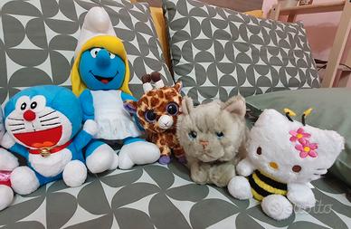 N.9 peluche tra cui n.3 Hello Kitty, n.1 Doraemon, n.1 Puffetta, n.1 Winnie the Pooh, n.1 Gattino grigio, n1 Giraffa, n.1 Scimmietta.