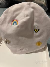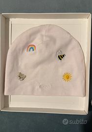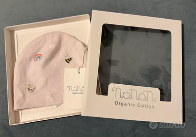 Nanan cappellino-cuffietta rosa chiaro in cotone biologico con ricami. Taglia 1, 1-6 mesi. Nuova, mai usata, ancora nella confezione originale.