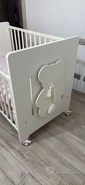 Lettino fiocco bianco con spondine che si alzano/abbassano da entrambi i lati, cassetto posteriore colore bianco, materasso incluso
