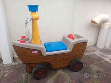 Gioco cavalcabile a forma di nave pirata Little Tikes, robusto e colorato, ideale per bambini piccoli. Dotato di quattro ruote stabili, seduta con vano portaoggetti, timone/manubrio e bandiera pirata frontale. Con rumori che simulano quelli di una barca. Il gioco stimola la fantasia, il movimento e la coordinazione motoria, permettendo al bambino di salire, sedersi e spingersi in autonomia. Realizzato in plastica resistente, adatto sia per uso interno che esterno. Usato, ma in buone condizioni e funzionante (richiede 2 pile AA incluse).
