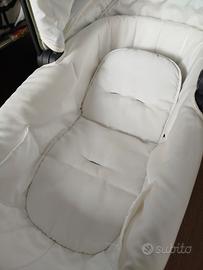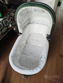 Navetta / navicella XL verde con accessorio base per portarla in giro per casa o cullarla (ha delle mini rotelline sotto che permettono di spostarlo trascinandolo). Il parasole si solleva parzialmente per fare passare l'aria in una sorta di zanzariera. L'interno è sfoderabile e lavabile in lavatrice: segnalo che l'avevo lavato ma ci sono un paio di macchie che molto probabilmente vanno via pretrattando con candeggina o smacchiatore. Ho visto che vendono anche la fodera come accessorio. Completo di materassino antisoffocamento e copertura verde (non presente in foto). Come si vede in foto, c'è il sistema di regolare lo schienale fino a portarlo quasi seduto, utile per i neonati che soffrono di reflusso. La navicella ha anche le gambe estraibili da sotto, mentre quando sono chiuse ha la base un po' curva che permette di dondolare e cullare il bimbo. Ps: avrei anche l'ovetto e il passeggino dello stesso trio. il passeggino è funzionante (lo sto ancora usando) ma un po' più usurato. Volendo ci si può accordare per l'intero set.