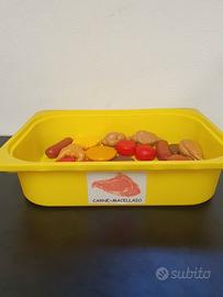 I prodotti del supermercato, la carne, frutta e verdura, i prodotti del forno e i formaggi.