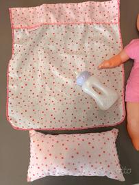 Nenuco Bambola Dormi Con Me con Baby Monitor Include una bambola Nenuco, una culla che si attacca al letto, un biberon, un cuscino, una copertina e un baby monitor interattivo. Grazie al baby monitor indossabile come braccialetto potrai scoprire in qualsiasi momento di cosa ha bisogno la tua Nenuco. Cliccando sul pulsante con la luna scoprirari se è felice o se ha bisogno delle tue cure. Mettendo il baby monitor sulla culla si accenderà e suonarerà una dolce ninna nanna! Il baby monitor funziona con 3 batterie LR44 (non incluse). La culla è in ottime condizioni. Il biberon ha la punta un po' rovinata. Il baby monitor ha le batterie scariche . Luci e suoni funzionano perfettamente ma le batterie devono essere sostituite. Casa non fumatori.