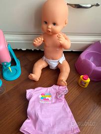 con ricette, tanti contenitori e frullatore funzionante a batteria! vestitino e pannolino lavabile perché se la bambola viene imboccata poi “elimina” la pappa nel pannolino..