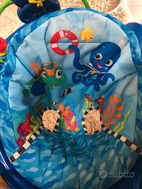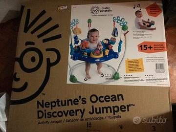 La stazione saltellante di baby einstein neptune's ocean discovery jumper offre al tuo bambino 360 gradi di attività stimolanti in un design salvaspazio che si adatta facilmente per crescere con il tuo bambino! Il Baby Neptune Jumper è dotato di una stazione giocattolo tartaruga elettronica che intrattiene il bambino con luci, suoni, musica e molto altro! Il bambino scoprirà numeri e colori. C'è un granchio che gira all'interno di una palla trasparente, una piccola stella marina che tiene uno specchio per la scoperta di sé stessi e un giocattolo a forma di polpo, schede flash con immagini della vita reale e molto altro.