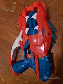 Blaster Nerf Dinosquad in colori rosso e blu, con dettagli che richiamano un dinosauro.