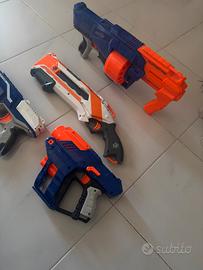 Vendo questo set da 4 fucili NERF in plastica in perfette condizioni e perfettamente funzionanti nei loro meccanismi con scatole di colpi in gomma: circa 300 se non di più.