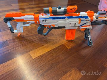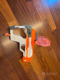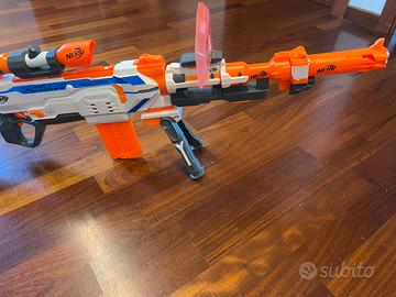 L’oggetto è in ottime condizioni. È elettrico e per funzionare richiede quattro batterie. Insieme al fuccile sono venduti un sacco si accessori: