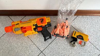 Pistole giocattolo Nerf Strike, una “automatica” che funziona a batterie (3xAAA) e una più piccola a colpo singolo. 37 proiettili in polistirolo.