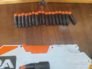 fucile giocattolo a dardi con caricatore da 25 colpi, e 22 in piu a parte, semi automatico a pile(arriva con pile e tecnicamente cariche)