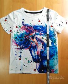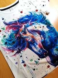 Il disegno sulla T-shirt rappresenta un cavallo stilizzato in uno stile acquerello molto vivace e artistico