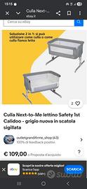 Vendo culla next to me Marchio safety buonissima in ottime condizioni comoda per attaccarla al lettone ha delle cinghie per attaccarla o da usare come culla