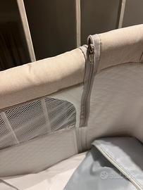 Lettino next to me comodo da spostare con ruote, ha due tasche laterali ed è composta da materasso incluso copri materasso.