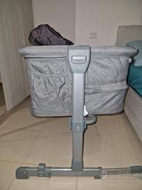 5 livelli di regolazione dell'altezza del materasso. È universale: i piedini regolabili consentono di adattare meglio il letto laterale al letto dei genitori, il fissaggio avviene tramite lunghe cinghie di sicurezza. L'angolo di inclinazione del materasso può essere regolato su 2 livelli