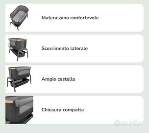 Vendo Next-to-me MAXI COSI Modello Iora, utilizzata pochisimo, come nuova, con tutti i suoi accessori. Altezza regolabile e compatibile con diversi letti.