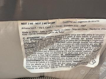 Vendo questa next 2 me della chicco. Ho messo la foto dell’etichetta dove si vede il nome oer esteso dell’articolo per conservi di cercarlo su internet per poter avere sottomano tutte le misure e specifiche del caso. Insieme alla next2me viene ceduto il materasso e qualche lenzuolino. Eseendo stato utilizzato per un po da una neonata il tutto si trova in ottime condizioni. Facile e veloce da montare e smontare, ha anche la sua pratica sacca qualora vi servisse portarvelo dietro per andare in vacanza, dai nonni o dove piu vi é congeniale. Qualsiasi info o domanda rimango a completa disposizione