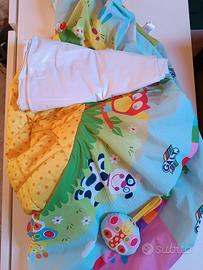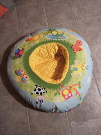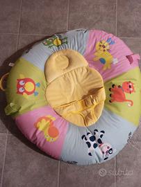 Utilizzabile da entrambi i lati. Da un lato, una morbida area dotata di cintura accoglie il bambino nei primi mesi: sull`arco, si agganciano 3 giochi colorati. Dall`altro lato, il bambino può stare seduto e giocare con le 8 attività multi-sensoriali posizionate sul bordo. Il rivestimento è lavabile in lavatrice. L`arco si pulisce con acqua.
