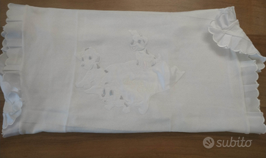 2) coperta bianca in maglia di SETA con ricamo cagnolini dalmata e balza: 10 euro