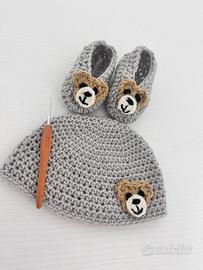 Include cappellino e scarpine coordinate, entrambi con dolce applicazione orsetto. Filato morbido, caldo e leggermente elasticizzato. Perfetto come regalo nascita o servizio fotografico.