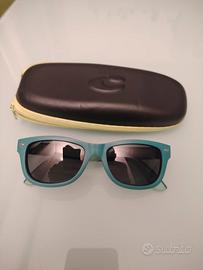 Vendo due paia di occhiali da sole da bambino, rispettivamente di color nero/arancione e verde/verde acqua.