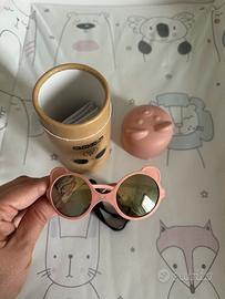Occhiali per neonati 0-12 mesi, colore rosa e lenti a specchio di categoria 3: filtrano il 100% dei raggi UV (UVA, UVB e UVC). Usati, ma tenuti molto bene.