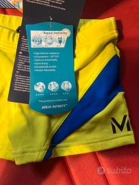 occhialini Aquasphere , adatti per piscina e per mare ; regalato insieme il costume in tessuto Aquainfiinity con asciugatura rapida .Bicolore light green e blu con culisse in vita per regolarlo.