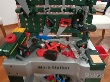 Officina giocattolo Bosch dimensioni 102x 60x40 completa di viti e pezzi da costruire, completo di avvitatori (3) chiavi inglesi cacciaviti seghe pinze, casco eccetera. completa di scatola.