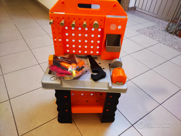 Banco di lavoro per il bambino che ama giocare a fare il meccanico o l'elettricista. Presenta anche un contenitore porta oggetti sotto il banco principale ed una parete a cui appendere gli attrezzi giocattolo.