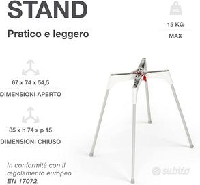 Sdraietta per il bagnetto del neonato, da 0 a 8 mesi. Portata massima: 8 kg. Misure d'ingombro massimo della sdraietta: L cm 28 x H cm 25 x P cm 64.
