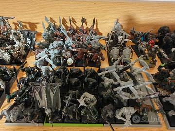 SOLO IN BLOCCO Eroi -Capoguerra orco su cinghiale (dipinto) -Sciamano orco selvaggio (dipinto fantasma) -2 sciamani goblin delle tenebre (1 primerato nero) -Grimgor (senza testa + dipinto) -2 sciamani goblin tenebre passoteschio -3 capi goblin tenebre passoteschio (1 primerato nero) Truppe -1 gettafolli -4 gettalance (1 dipinto fantasma) -20 orchi neri plastica (10 dipinti) -21 orchi neri metallo (5 dipinti + 5 primerati nero) -20 cavalcaragni -1 carro orco (dipinto + manca 1 testa 1 falce e lo stendardo) -1 carro orco leggermente malandato -1 carro goblin -12 troll (1 di passoteschio gli altri 11 sono riproduzioni in resina primerati nero/bianco) -3 squig e 2 mandriani (squig dipinti) -2 saltasquig (dipinti) -6 fanatici metallo (solo 1 con la palla, alcune palle da reincollare) -15 orchi arcieri (1 arco rotto + 7 dipinti) -20 ragazzi orchi (primerati nero) -40 ragazzi orchi monoposa (circa la metà dipinti o primerati nero) -40 goblin arcieri -116 goblin tenebre (circa 40 dipinti fantasma / 20 primerati di nero / 39 vecchia edizione con condizioni non ottimali) 8 cavalcacinghiali selvaggi (6 cinghiali dipinti) 20 orchi selvaggi Varie basette Alcuni modelli hanno delle monete da 1/2 centesimi sotto per un eventuale magnetizzazione. Dove vedete scritto "dipinto fantasma" significa che gli sono state date 3 mani di diversa tonalità di grigio a pennello asciutto per un progetto di un armata simil-fantasma. Come potete constatare i modelli non sono in condizioni perfette. Prezzo totale 350 euro.