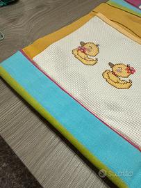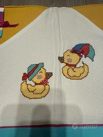 Vendo grazioso organizer da parete in tessuto, decorato a mano con ricami a punto croce raffiguranti anatroccoli.