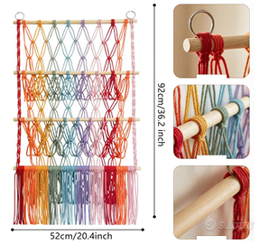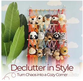 Organizer rete porta Peluche Macramè Arcobaleno – 3 Livelli – NUOVO Cerchi un modo magico e ordinato per riporre la montagna di peluche in cameretta? Vendo questa splendida Rete Porta Peluche PUYUKO a 3 livelli, realizzata a mano in stile macramè boho con colori arcobaleno. 🧸🌈 Non è solo un organizer, ma un vero e proprio elemento d'arredo che trasforma il caos in una decorazione da rivista! Perché è fantastico: Capacità Extra: Misura 92×52 cm. Grazie ai 3 ripiani, può ospitare tantissimi peluche, bambole, palloni o coperte, liberando finalmente il pavimento. Stile Boho & Arcobaleno: Realizzato con corde intrecciate resistenti e arricchito da frange colorate. Perfetto per camerette, nursery o angoli gioco. Qualità Premium: Corda spessa e intreccio rinforzato per evitare strappi o sfilacciamenti anche con l'uso quotidiano dei bambini. Salvaspazio Intelligente: Sfrutta l'altezza della parete o il retro della porta. I peluche rimangono in vista (così i bimbi li trovano subito) ma in perfetto ordine. Montaggio Facilissimo: Nella confezione sono inclusi i chiodini "senza traccia". Si appende in pochi minuti e si può regolare la tensione dei nodi a piacimento. Ideale per: 🎁 Un regalo utilissimo per nascite, compleanni o per chi segue il metodo Montessori per l'ordine dei giochi. Condizioni: 💎 Nuovo, mai usato. Ancora nella sua confezione originale. 📦 Spedizione rapida