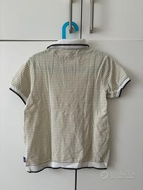 Cotone 100%, fantasia a quadretti beige e bianchi con profili in bordo a coste bianchi e blu alle maniche, al colletto e alla parte inferiore. 2 bottoni