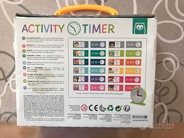 Activity – Timer (Attività Orologio) è stato ideato per aiutare i bambini a comprendere l'evoluzione del tempo, delle ore e minuti in modo divertente. L'orologio, realizzato in plastica resistente, è dotato di una ruota laterale che i bambini possono girare da soli. Il quadrante è diviso in ore e minuti con numeri chiari e divisi in colori differenti. Viene fornito con 12 schede di lavoro che illustrano attività quotidiane per aiutare i bambini a dire l'ora in modo analogico e digitale.