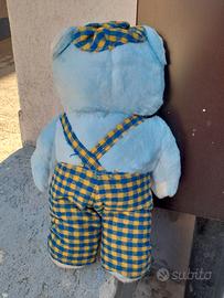 Orsetto di peluche azzurro con una simpatica salopette a quadri gialli e blu. - Morbido al tatto. - Dettagli ricamati sul muso.