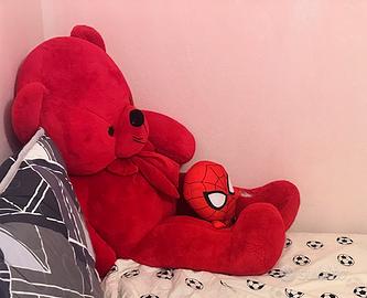 Vendo per inutilizzo questa simpatica coppia di peluche, perfetti come regalo o per arredare una cameretta! • Orso Gigante: Un morbidissimo orso di colore rosso intenso con un elegante fiocco al collo. È molto grande, ideale per gli abbracci o come elemento d'arredo. • Spider-Man: Un piccolo e soffice Spidey coordinato nei colori, perfetto da tenere tra le braccia dell'orso o da usare separatamente. Complessivamente buone e puliti. Come visibile in foto, l'orso presenta un piccolo segno d'usura sulla gamba sinistra (facilmente riparabile o trascurabile), per il resto è in ottimo stato.