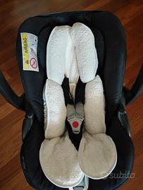 Viene venduto con riduttore per neonato in morbida spugna di cotone, copertura in cotone (colore neutro: panna con stelline grigie) e base isofix.
