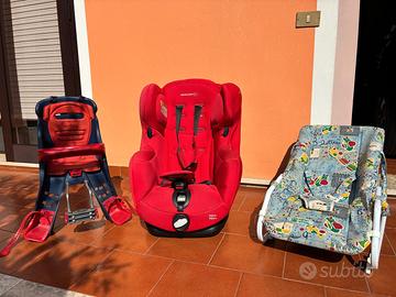 Vendo un pacchetto di accessori per Bambini piccoli.N. 1 Lettino da viaggio, n. 1 passeggino, n. 1 seggiolone reclinabile per la nanna, n. 1 ovetto /trasportino, n 2 seggiolini da auto ( 1 per neonati e 1 per bambino sino a 1 MT), n 2 seggiolini da bicicletta. In più n. 1 bicicletta da gioco per neonato, n. 1 bicicletta per bambino di 4 anni , più altri g iochi ( queste ultime non sono rappresentate nelle foto).