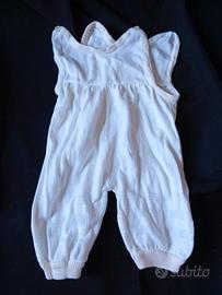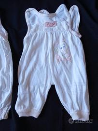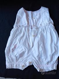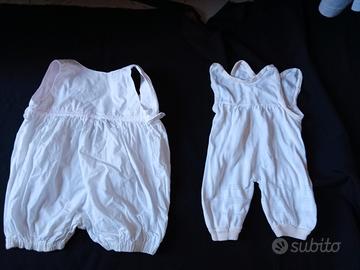 Vedo due pagliaccetti leggeri per neonate, colori bianco e rosa, dimensioni sx lungo 42 cm, da spalla a spalla 21 cm; dx lungo 41 cm, spalla 18. Quello a sx ha sull'orlo della gamba piccole macchie vedi foto. Ottime condizioni generali