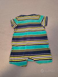 Pagliaccetto a righe per neonato. - Righe blu scuro, verdi e gialle. - Scollo con bottoni. - Maniche corte. - Chiusura con bottoni a pressione sul cavallo. Guarda gli altri miei articoli da bambino: se sei interessato a più articoli faccio ottimi sconti!