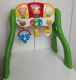 Un'originale palestra 3 in 1 che segue il bambino in tutte le fasi della crescita nel suo primo anno di vita. La parte centrale è infatti dotata di tasti musicali e luminosi che il bimbo può utilizzare da sdraiato; ruotandola o separandola dal resto della struttura la palestrina può diventare un colorato tavolo di gioco oppure un centro attività da appendere alla culla e al lettino. Anche i pendenti si staccano e possono essere utilizzati separatamente.