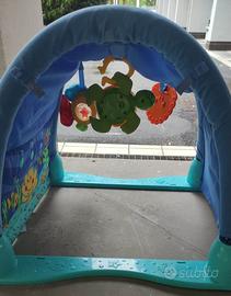 Palestrina Acquario Fisher Price 3 in 1: è un soffice e morbido tappeto che accompagna la crescita del bambino (da 0 a 24 mesi) in tre diverse modalità: nella fase supina (1) verrà stimolato dagli archi dotati di colorati sonaglini (di cui uno musicale), che potranno essere fissati al tappetino (2) una volta che il bambino, sviluppando i muscoli del collo, sarà in grado di giocare a pancia in giù. E quando gattonerà (3)? Il tappetino si trasformerà in un divertentissimo tunnel!