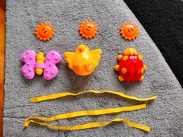 Struttura facile da montare, in plastica colorata, con una sfera a più strati separati e una rotante con palline all'interno. Compresi 3 giochi da appendere (la coccinella è un piccolo specchio).